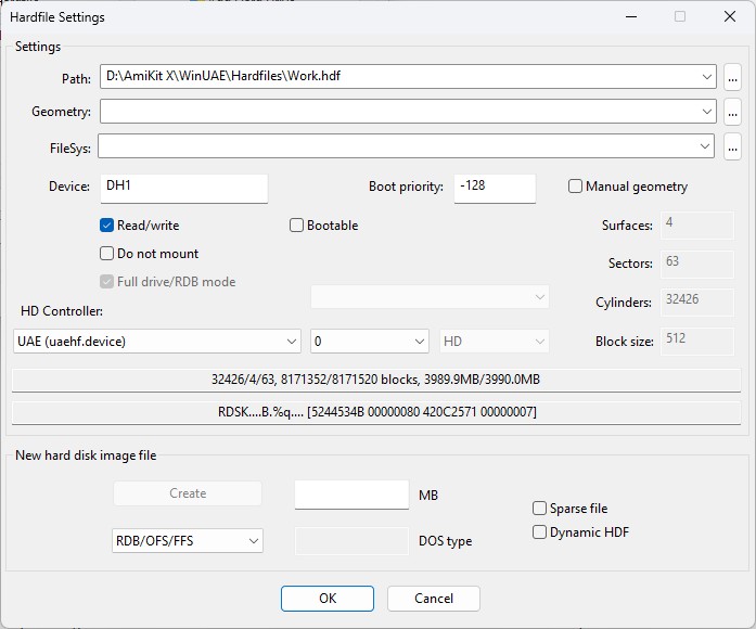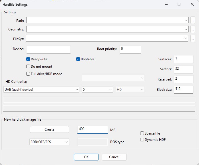 and you cannot access them from the PC side. To create a hardfile, select Add Hardilfe, then specify its size in megabytes e.g. 400 for a 400MB HardFile, then click Create, select a folder and specify a filename for the new HDF file and click Save. To add an existing HDF file, click on the dots for Path, specify a Device name e.g. DH1, set any other options such as Read/Write and Bootable and click ok to add it the virtual machine.