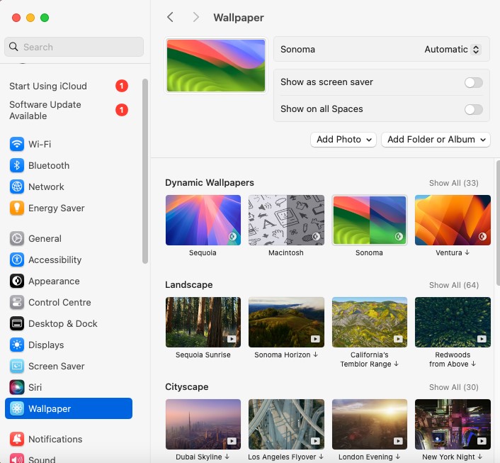 Appearance - Set Light, Dark or Auto mode, accent colour highlight colour, sidebar icon size, wallpaper tinting and scroll bars.