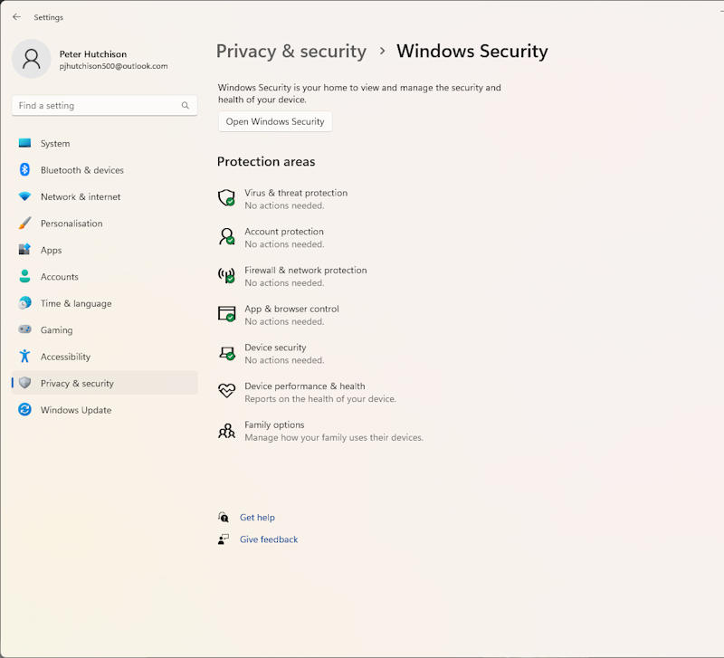 All the main security features are shown in the security window and can be shown as No actions nodded, Actions Recommended and so on.